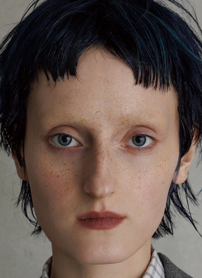 ファンデーションは肌の赤みをカバーし、ルースパウダーをブラシで重ね、シアーマットな質感に仕上げる。
